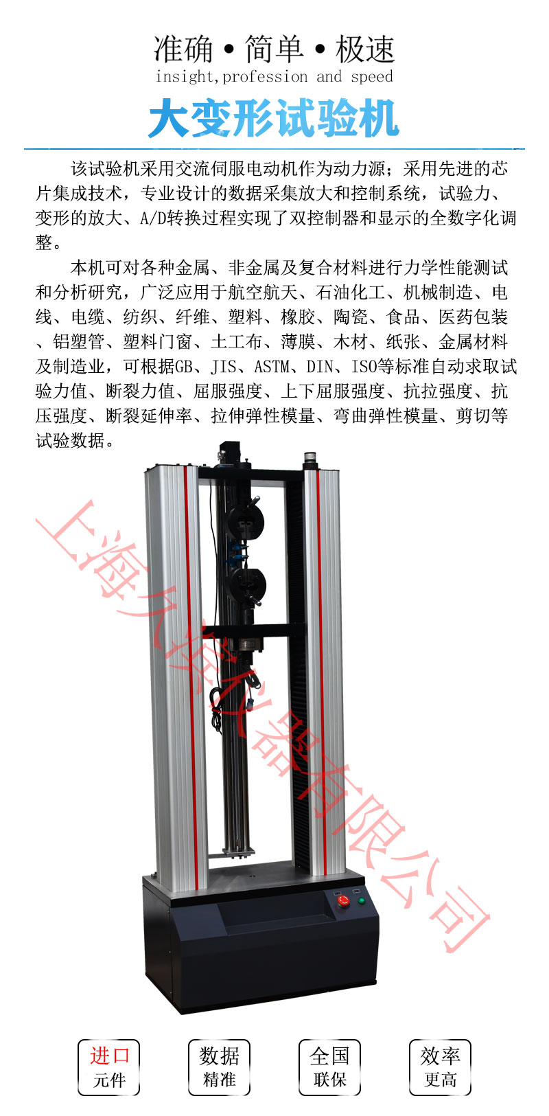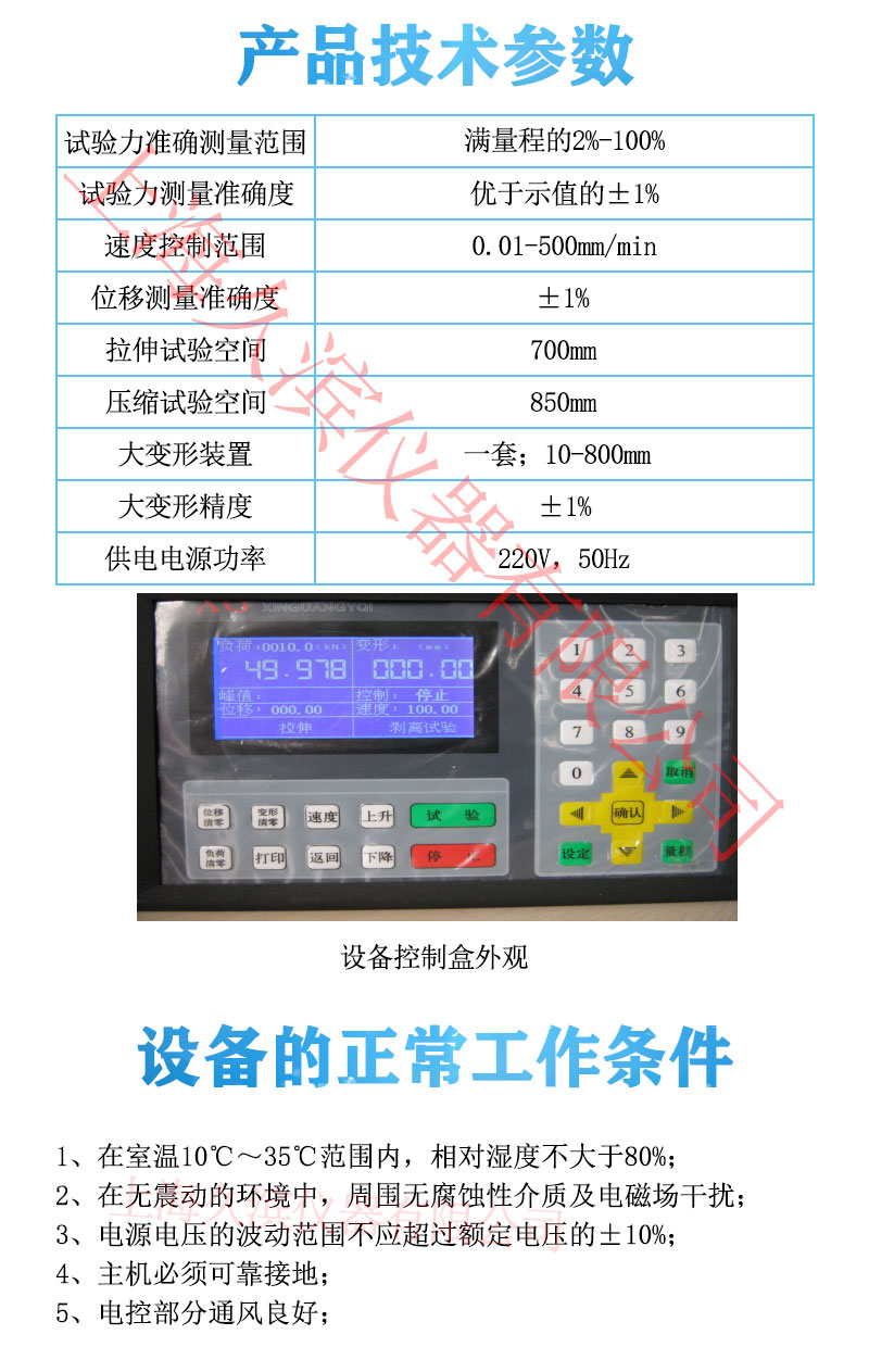該試驗(yàn)機(jī)采用交流伺服電動(dòng)機(jī)作為動(dòng)力源;采用先進(jìn)的芯片集成技術(shù),專(zhuān)業(yè)設(shè)計(jì)的數(shù)據(jù)采集放大和控制系統(tǒng),試驗(yàn)力、變形的放大、A/D轉(zhuǎn)換過(guò)程實(shí)現(xiàn)了雙控制器和顯示的全數(shù)字化調(diào)整。