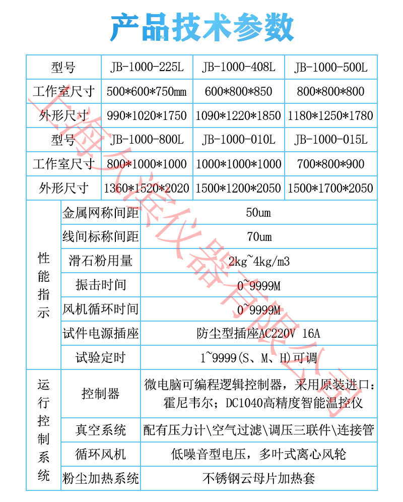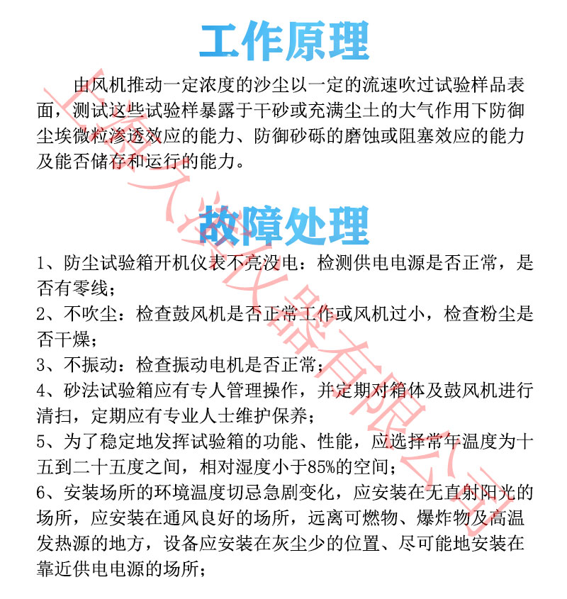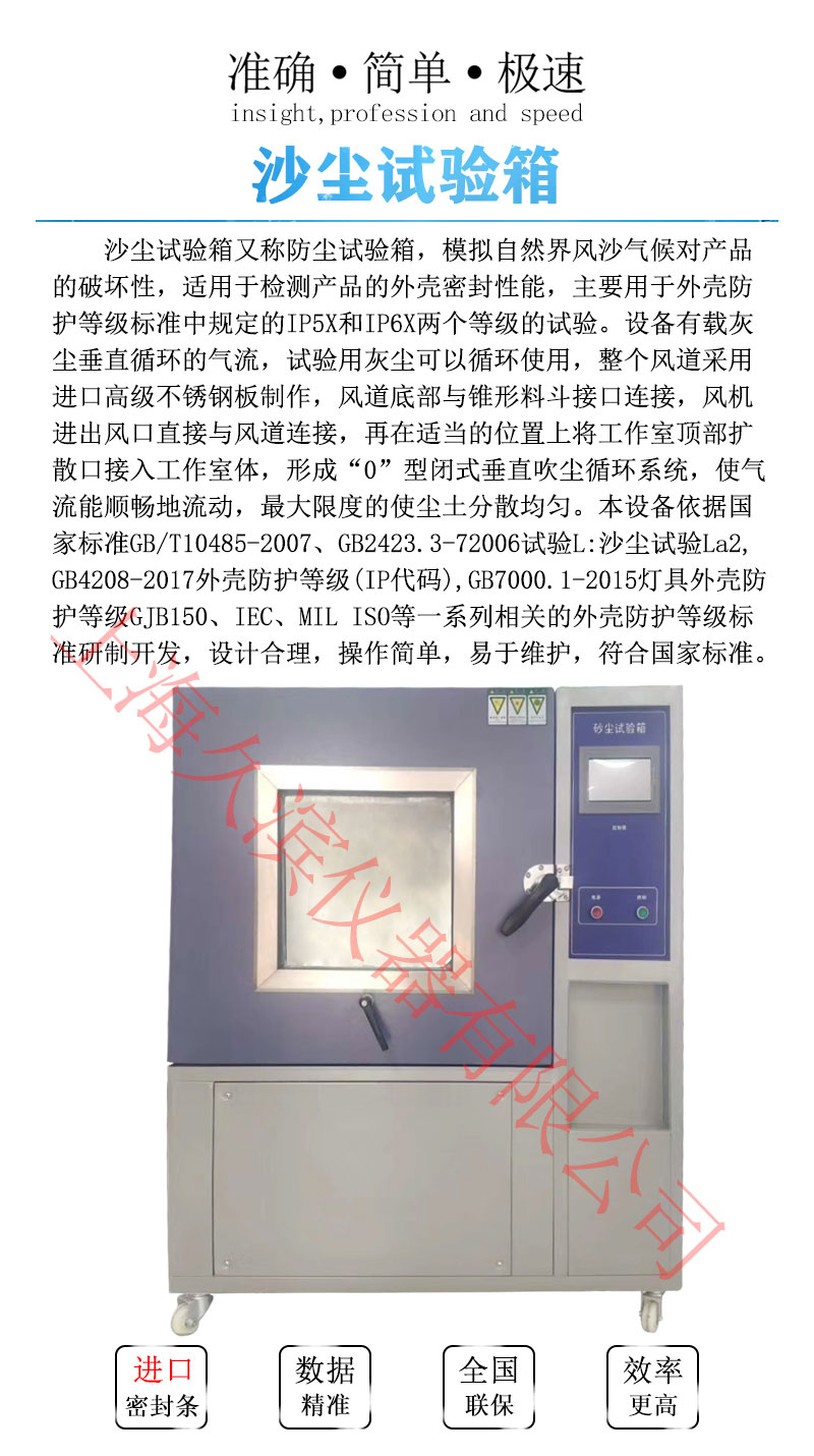 沙塵試驗(yàn)箱模擬自然界風(fēng)沙氣候?qū)Ξa(chǎn)品的破壞性,適用性檢測產(chǎn)品的外殼密封性能,主要有于外殼防護(hù)等級標(biāo)準(zhǔn)中規(guī)定的IP5X和IP6X兩個等級的試驗(yàn)。設(shè)備有載灰塵垂直循環(huán)的氣流,試驗(yàn)用灰塵可以循環(huán)使用,整個風(fēng)道采用進(jìn)口高級不銹鋼板制作,風(fēng)道底部與錐形料斗接口連接,風(fēng)機(jī)進(jìn)出風(fēng)口直接與風(fēng)道連接,再在適當(dāng)?shù)奈恢蒙蠈⒐ぷ魇翼敳繑U(kuò)散口接入工作室體,形成“O”型閉式垂直吹塵循環(huán)系統(tǒng),使氣流能順暢地流動,*大限度的使塵土分散均勻。