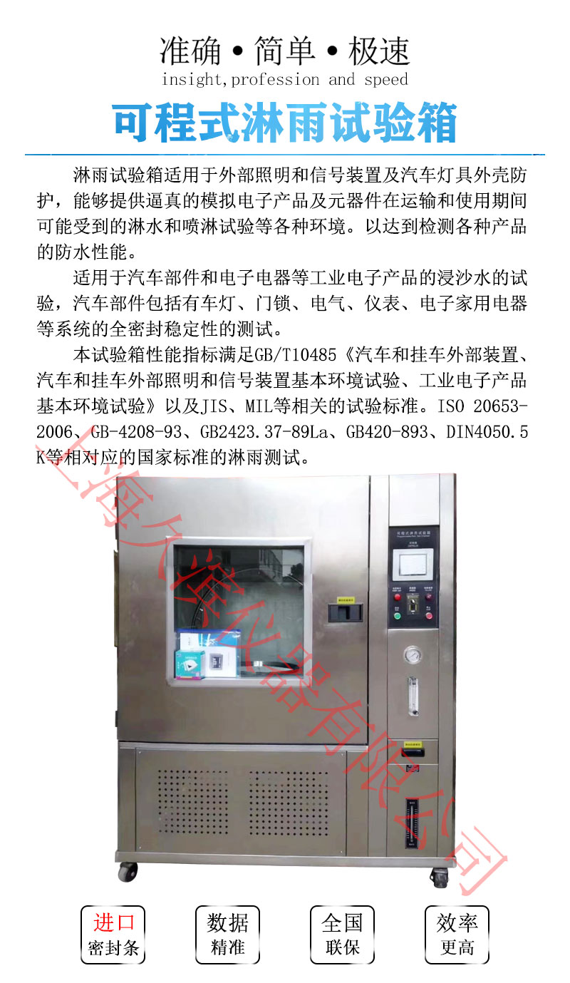 本設(shè)備主要用于考核電工電子產(chǎn)品外殼/密封件在水試驗(yàn)后或者在試驗(yàn)期間是否能保證該設(shè)備及元器件良好的工作性能和技術(shù)狀態(tài)。產(chǎn)品技術(shù)引用依據(jù),GB2423.38-90和GB/T4942.2-93;GB4208;GB4706;GB7000中有關(guān)技術(shù)參數(shù)設(shè)計(jì)制作的。適用人工淋雨試驗(yàn)。
